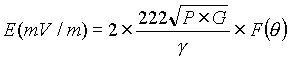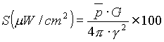 式中: P──發射機功率,KW; G──相對于半波偶極子的天線增益,DB; r──被測點與發射天線的距離,Km; F(θ)──天線垂直面方向性函數(視天線型式和層數而異)。 A.2.5.4 雷達等微波功率密度S計算公式: